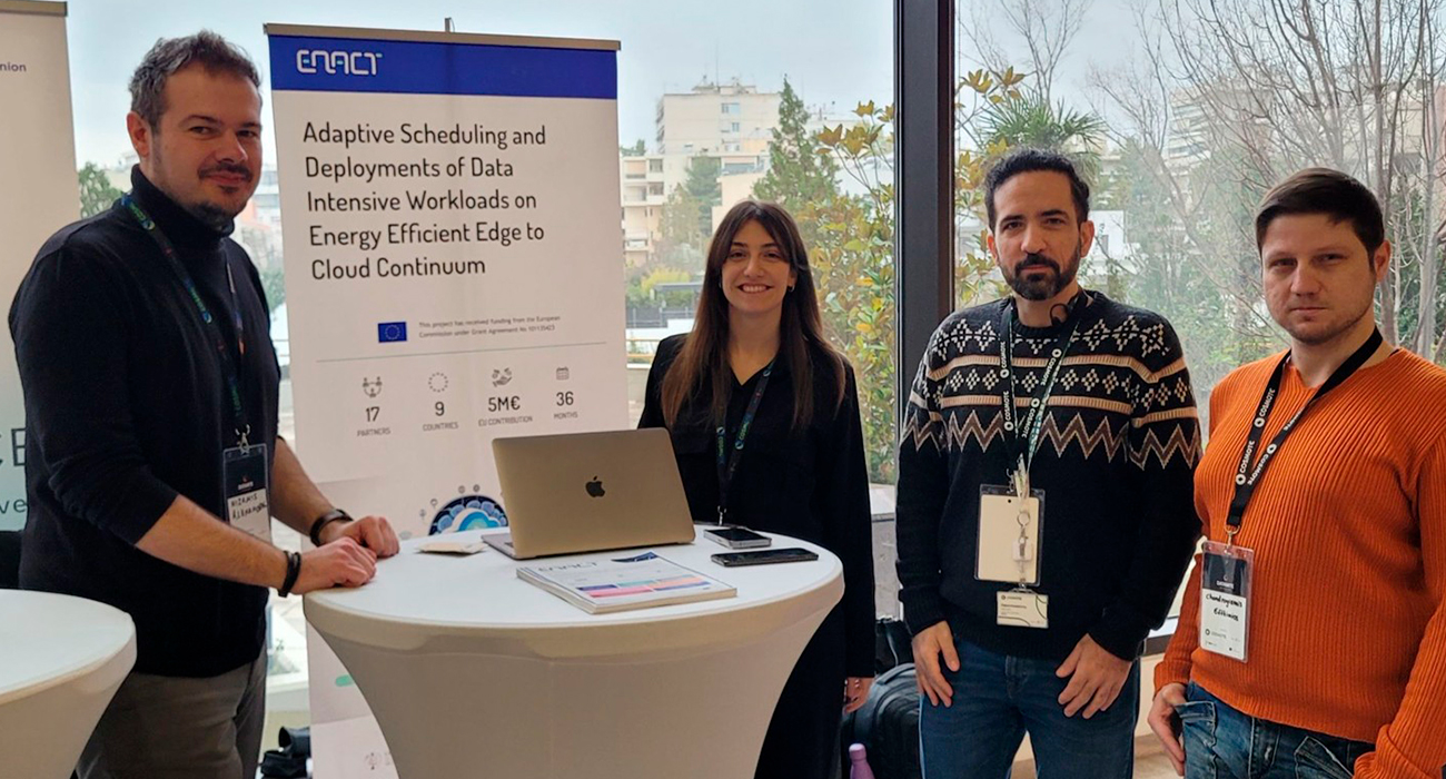 At the dedicated ENACT booth, the consortium presented its vision for the Cognitive Computing Continuum (CCC) and its ongoing work to optimize distributed applications across the edge–cloud continuum. Visitors to the stand had the opportunity to learn how ENACT is developing AI-driven orchestration and adaptive management tools that enable applications to dynamically allocate computing resources, ensuring optimal performance, energy efficiency, and scalability in real-time environments.
